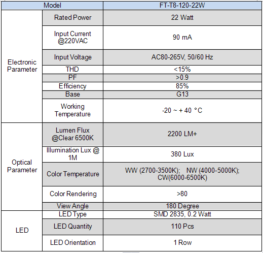 | FT-T8-120-22W | 1198 | 1212 | 26 | 310g |